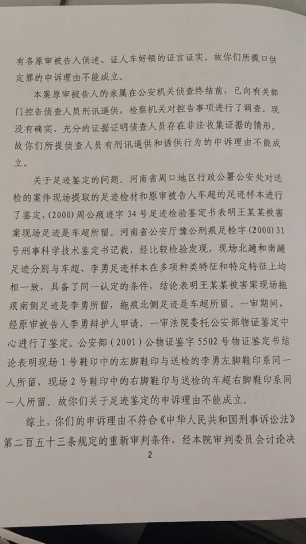 安徽高院认为,此案在侦查阶段和一审阶段共做出过3次鉴定,具备同一认定条件。且在案件一审时,法院曾委托公安部物证鉴定中心做出鉴定,证实现场左脚鞋印与李勇左脚鞋印系一人所留,现场右脚鞋印与车超右脚鞋印系一人所留。