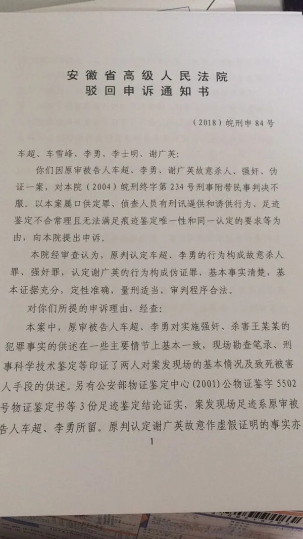 早前报道:安徽高院驳回车超奸杀案申诉,省检去年提再审检察建议