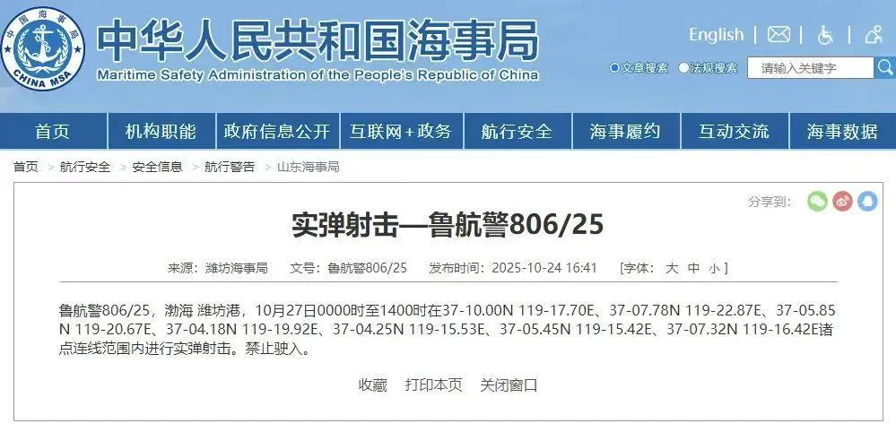 据中国海事局网站消息,潍坊海事局发布航行警告,10月27日0时至14时,渤海潍坊港部分海域进行实弹射击,禁止驶入。