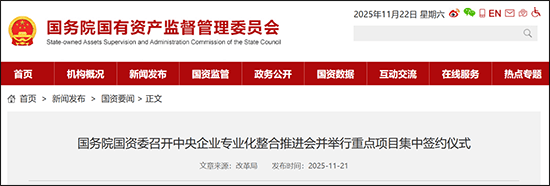 国务院国有资产监督管理委员会网站消息,11月21日,国务院国资委组织召开中央企业专业化整合推进会并举行重点项目签约仪式。