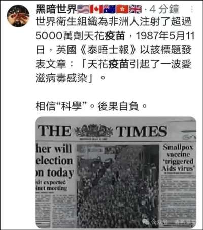 1992年,美国《科学》杂志刊登论文《猴病毒与HIV的同源性分析》,指出“早期天花疫苗可能携带了SIV(猴免疫缺陷病毒)的变异株,最终演变为HIV”。
